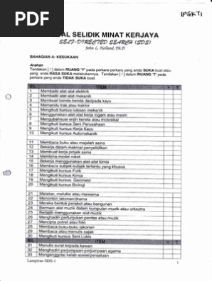 Inventori minat kerjaya holland pdf. Sila kira jawapan yang bertanda. Kaedah mentafsir skor dan tafsiran skor dalam kod tiga hurufyang dapat menjelaskan pola personaliti dari enam jenis personaliti yang berkaitan dengan minat kerjaya seperti yang dijelaskan oleh holland 1973. Ujian minat kerjaya sds holland setiap individu perlu membuat keputusan mengenai kerjaya dan mereka perlu menyesuaikan masalah yang berkaitan dengan pemilihan kerjaya kerana kerjaya merupakan kegiatan utama dan menentukan cara serta gaya hidup seseorang. Analisis minat kerjaya holland ujian self directed search sds 6 kelompok kerjaya manusia.