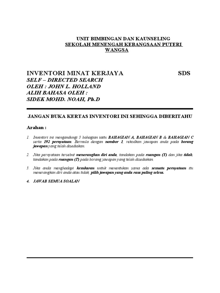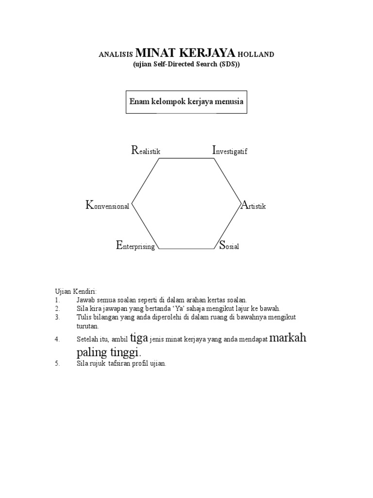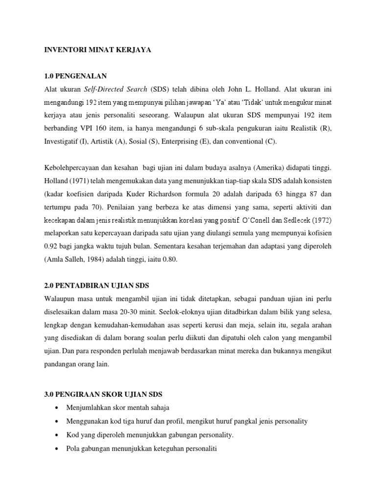 Selain secara online anda boleh kenal pasti minat kerjaya anda menerusi inventori psikologi yang sama standardnya seperti self directed search sds strong interest inventory ujian minat kerjaya sidek dan profil personaliti tajma. Satu set inventori minat kerjaya sds versi malaysia amla 1984. Kaedah mentafsir skor dan tafsiran skor dalam kod tiga hurufyang dapat menjelaskan pola personaliti dari enam jenis personaliti yang berkaitan dengan minat kerjaya seperti yang dijelaskan oleh holland 1973. Holland powell fritzsche 1994.