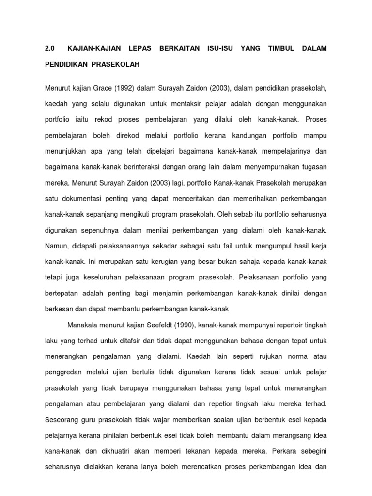 Pendahuluan pendidikan awal kanak kanak merupakan pendidikan peringkat awal usia kanak kanak. Dia antara cikgu yang paling awal berkobar kobar dan ghairah mengisi borang. Penulisan ini telah di jalankan secara terperinci bagi mengetahui serba sedikit mengenai isu isu polisi kurikulum dasar pengajaran dan pembelajar p p dan juga masalah berkaitan penglibatan ibu bapa di peringkat tadika prasekolah. 2 0 kajian kajian lepas berkaitan isu isu yang timbul dalam pendidikan prasekolahmenurut kajian grace 1992 dalam surayah zaidon 2003 dalam pendidikan prasekolah kaedah yang selalu digunakan untuk mentaksir pelajar adalah dengan menggunakan portfolioiaitu rekod proses pembelajaran yang dilalui oleh kanak kanak.
