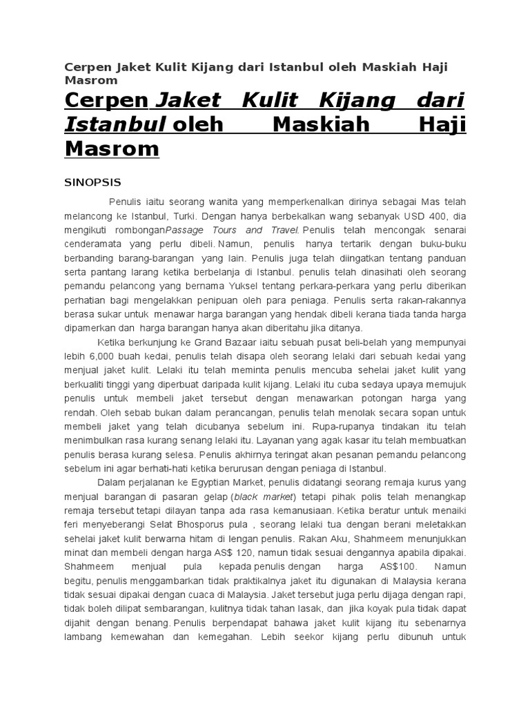 Cerpen jaket kulit kijang dari istanbul. Sinopsis tema persoalan plot teknik plot watak dan perwatakan latar tempat latar masa latar masyarakat gaya bahasa nilai pengajaran soalan peperiksaan skema jawapan contoh soalan jawapan cerpen jaket kulit kijang dari istanbul k2. Mas merupakan seorang wanita cantik yang mengikuti pakej percutian ke turki. Sinopsis komsas tingkatan 4 maskiah haji masrom mengisahkan aku melancong ke negara turki sambil mencari cenderahati untuk di bawa pulang ke malaysia.