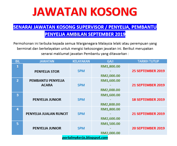 Jawatan kosong september 2019. Full time seluruh malaysia 18 04 2018. Permohonan jawatan kosong guru tabika sehingga september 2019 admin miz. Tarikh tutup permohonan. Job vacancies in malaysia latest job vacancn malaysia augu8t september 2020.
