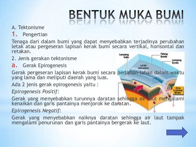 Jenis bentuk muka bumi. Tenaga endogen meliputi tektonisme patahan dan lipatan vulkanisme dan seisme gempa bumi. Sedangkan tenaga eksogen sebagai contoh adalah pengikisan erosi bisa oleh air angin gelombang gletser dan organisme pelapukan pelapukan fisik kimiawi dan pelapukan biologis dan pengangkutan material. Teori mengenai bentuk muka bumi. Lapisan batu batuan bukit tidak bercantum dengan plat bumi menjadikan bukit tidak kukuh dan boleh runtuh atau bergerak apabila berlaku pergerakan bumi.