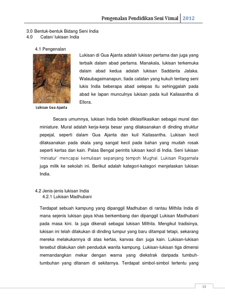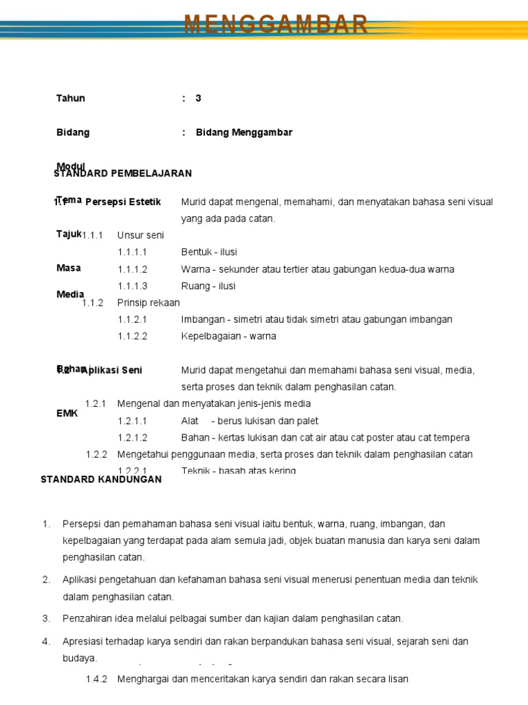 Penekanan diberikan kepada kemahiran menguasai media dan teknik yang merangkumi cat akrilik cat poster cat minyak dan cat air. Komponen alat yang digunakan dalam catan. Biasanya permukaan bagi penghasilan catan adalah kertas atau kanvas. Pada masa itu aktiviti catan hanya menggambarkan kisah kisah keagamaan.