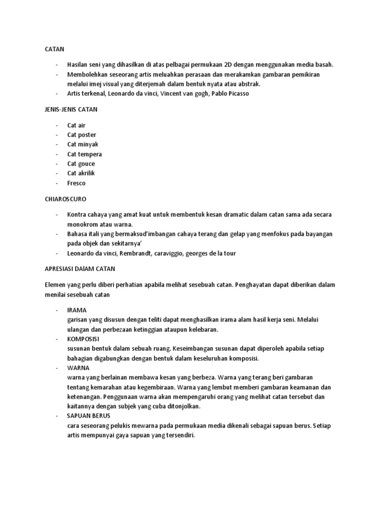 Catan merupakan hasil seni warna pada permukaan yang rata. Bahan pewarna dari tumbuh tumbuhan pula seperti kunyit pinang inai senduduk juga boleh digunakan menghasilkan catan. Bahan warna yang biasa digunakan untuk menghasilkannya ialah cat air cat minyak poster colour atau akrilik. Fill in your details below or click an icon to log in.