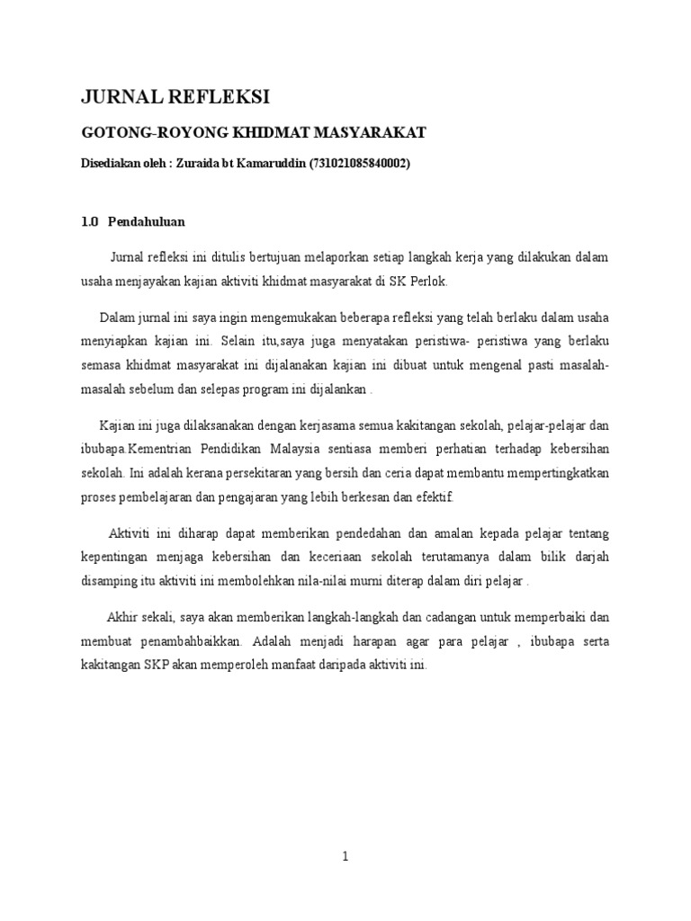Jurnal refleksi khidmat masyarakat gotong royong. Gotong royong memiliki sifat ketersalingan reciprocality dimana anggota masyarakat saling menyadari keterkaitan dan ketergantungan satu dengan yang lainya. Setelah gotong royong selesai dijalankan kami semua berkumpul untuk menikmati jamuan yang telah disediakan dan majlis penyampaian cenderamata. Sekolahku bersih mindaku cerdas. Jurnal refleksi khidmat masyarakat jurnal refleksi.