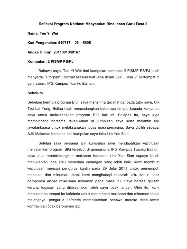 Jurnal refleksi khidmat masyarakat. Refleksi khidmat masyarakat refleksi khidmat masyarakat yang telah saya laksanakan ialah bertempat di bilik tembikar di jabatan pendidikan seni visual yang telah dilaksanakan pada 12 september 2014. Saya memilih untuk melaksanakan tugasan ini kerana kami diberi peluang untuk memilih program khidmat masyarakat yang ingin dilaksanakan. Saya memilih untuk melaksanakan tugasan ini kerana kami diberi peluang untuk memilih program khidmat masyarakat yang ingin dilaksanakan. Khidmat masyarakat ialah kerja kerja kemasyarakatan yang dilaksanakan secara berkumpulan dan mempunyai matlamat serta tujuan tertentu.