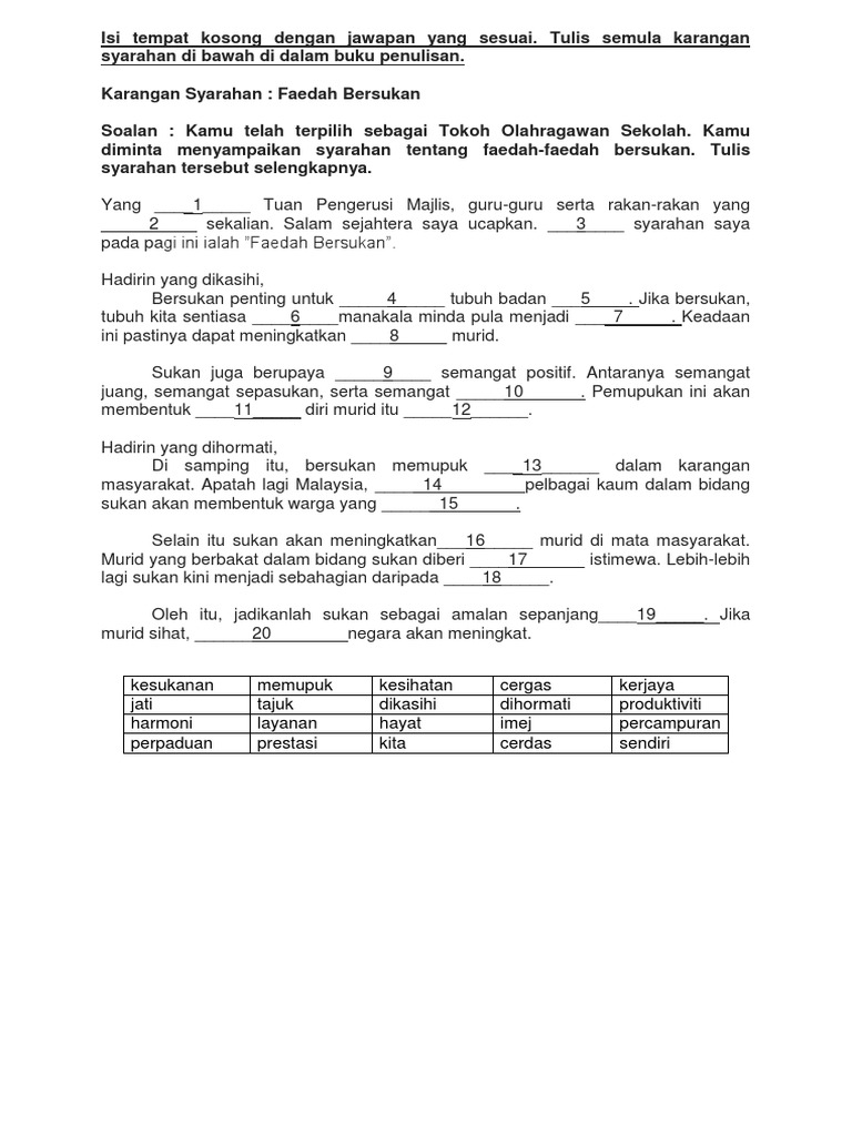 Tulis semula karangan yang lengkap. Karangan isi tempat kosong dengan jawapan yang betul. Isi tempat kosong dengan jawapan yang sesuai. 28 set latihan karangan isi tempat kosong sesuai untuk murid tahap 2 tahun 4 5 6 march 18 2020 april 8 2020 mycikgu 02 berikut merupakan 28 set latihan karangan isi tempat kosong bukan sahaja dapat membantu meningkatkan penguasaan kosa kata bahasa melayu malah latihan ini juga dapat membantu murid dalam menguasai kemahiran menulis karangan.