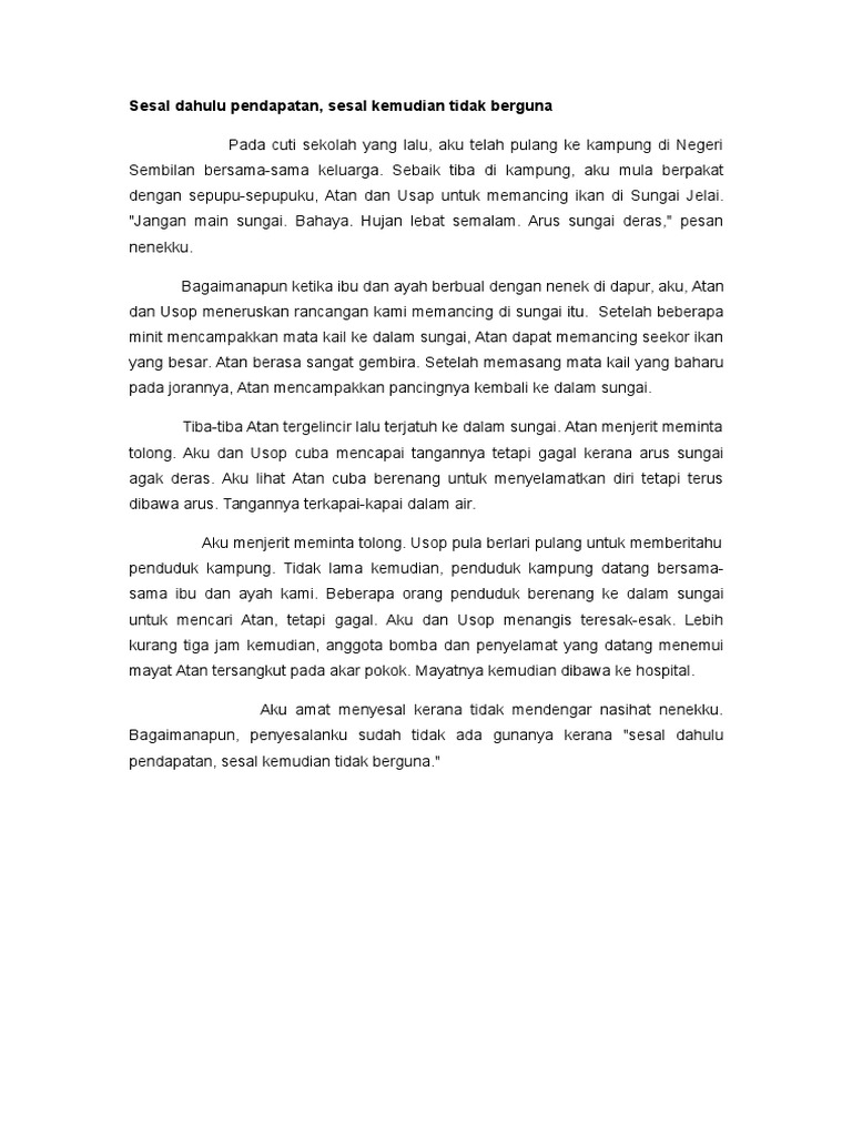 Sebaik tiba di kampung aku mula berpakat dengan sepupu sepupuku atan dan usap untuk memancing ikan di sungai jelai. Ingatlah peribahasa sesal dahulu pendapatan sesal kemudian tidak berguna tambahan pula permainan tradisional juga merupakan satu daya tarikan yang signifikan dalam industri pelancongan. Sesal dahulu pendapatan sesal kemudian tidak berguna. Sakit menimpa sesal terlambat sesudah terlanjur terjadi menyesal tidak ada gunanya.