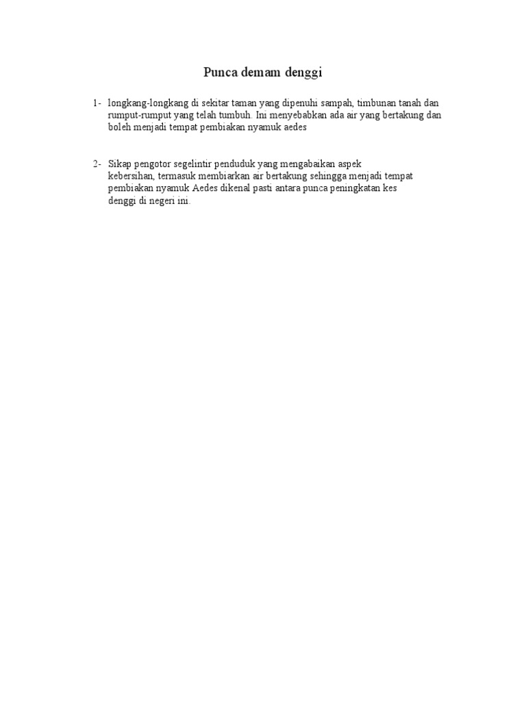 Karangan punca demam denggi spm. Darah merupakan salah satu komponen utama untuk menghasilkan telur bagi nyamuk betina kerana ia mengandungi protein. Pendedahan awal kepada anak anak tentang kebersihan kawasan rumah merupakan langkahmenangani pembiakan nyamuk aedes dan penyakit demam denggi. Di malaysia jumlah kes yang berpunca daripada penyakit denggi dilaporkan meningkat saban tahun dan telah meragat banyak nyamuk. Kualiti dijamin dan pengolahan diyakini.