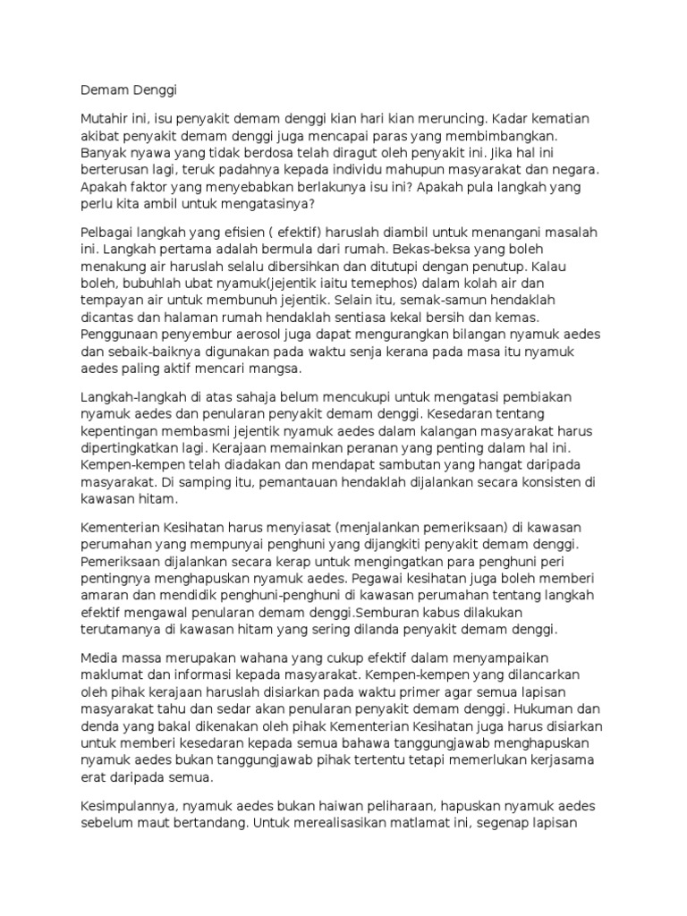 Pendedahan awal kepada anak anak tentang kebersihan kawasan rumah merupakan langkahmenangani pembiakan nyamuk aedes dan penyakit demam denggi. Karangan jenis fakta. 1 longkang longkang di sekitar taman yang dipenuhi sampah timbunan tanah dan rumput rumput yang telah tumbuh. Di malaysia jumlah kes yang berpunca daripada penyakit denggi dilaporkan meningkat saban tahun dan telah meragat banyak nyamuk.