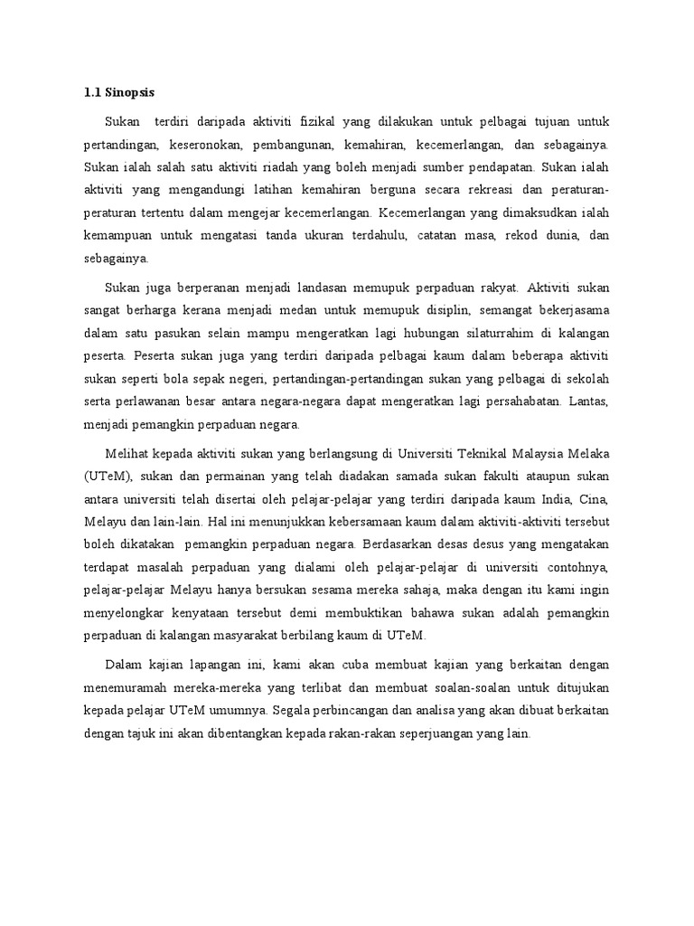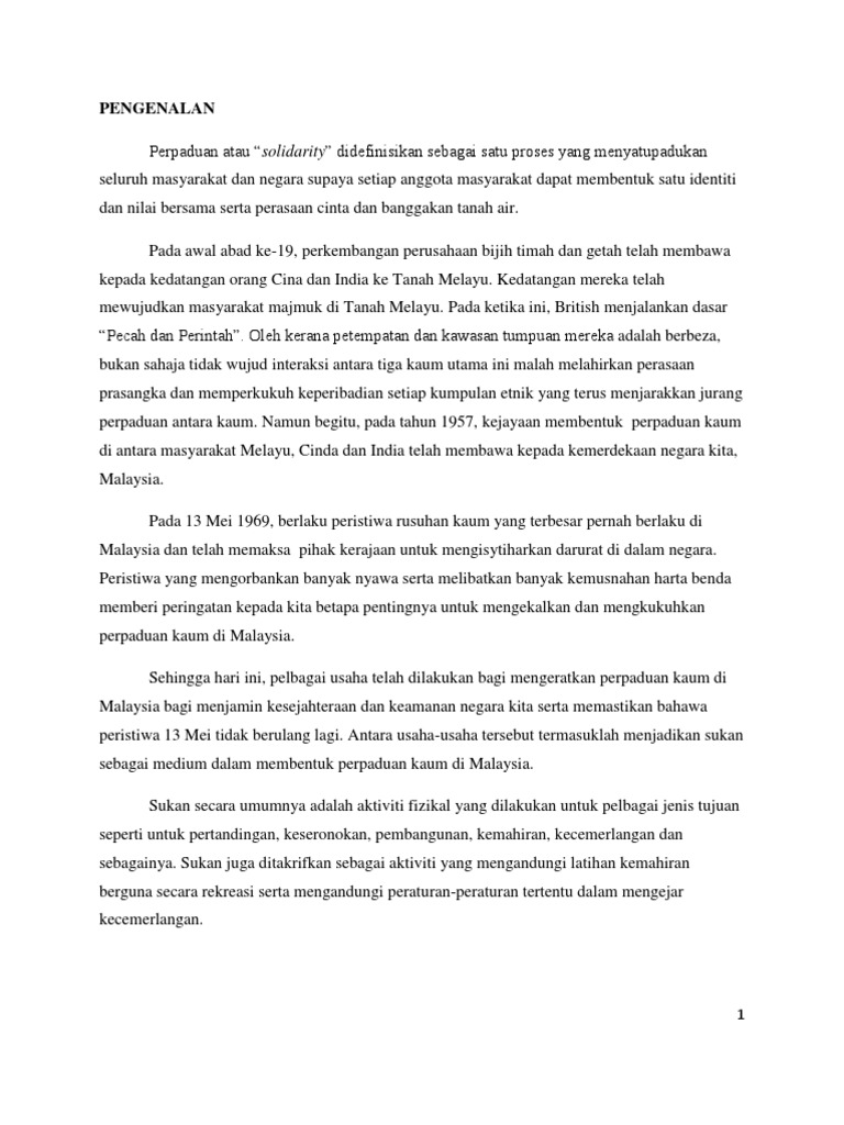 Sukan sebagai alat perpaduan harus diketengahkan dengan lebih tersusun di pelbagai ruangan termasuk sekolah dan kawasan penempatan. Jelaskan tentang sukan untuk perpaduan berperanan sebagai alat perpaduan tanpa mengira ideologi menyemarakkan semangat patriotik dalam kalangan rakyat penyertaan aktiviti sukan tidak terhad kepada kaum tertentu membuka peluang seluas luasnya bagi mereka yang berminat di peringkat sukan adalah aktiviti kokurikulum. Sebagai konklusinya semua pihak haruslah berganding bahu ibarat ke bukit sama sama didaki ke lurah sama sama dituruni untuk memastikan perpaduan dalam kalangan rakyat dapat dikekalkan. 2 3 perpaduan melalui sukan 1.