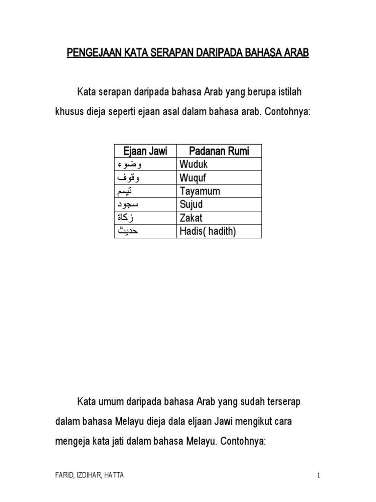 Sebagian kata kata arab ini masih utuh dalam erti yang sesuai antara sebutan dan maknanya dan ada sebahagian lagi berubah. Perbendaharaan kata bahasa melayu yang berasal dari bahasa arab cukup banyak diperkirakan sekitar 2 000 3 000. Pedoman umum ejaan jawi bahasa melayu 1. Namun kelazimannya tidak terlalu besar.
