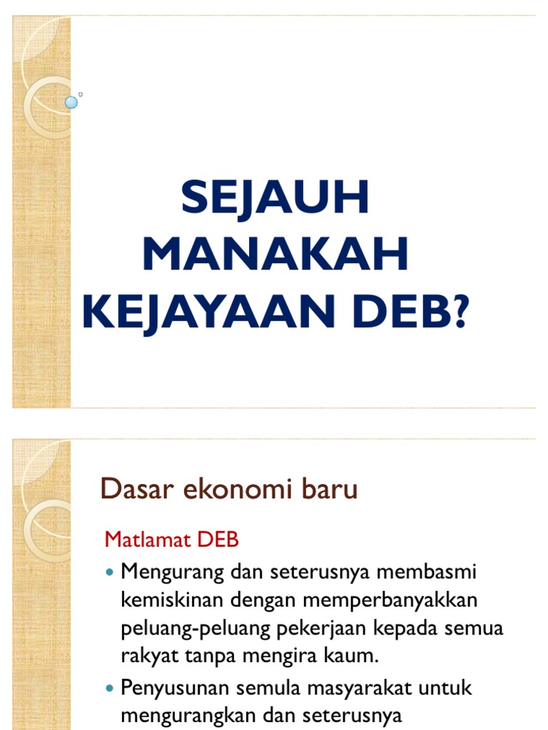 Kejayaan dasar ekonomi baru deb. Dasar ekonomi baru merupakan satu bentuk perancangan yang dilancarkan oleh kerajaan dalam tahun 1970 melalui rancangan malaysia kedua. Dasar ekonomi baru yang bermatlamatkan perpaduan negara melalui prosespembasmian kemiskinan dan penyusunan. Dasar yang dikenali sebagai dasar ekonomi baru ini adalah satu dasar yang dilancarkan oleh kerajaan dalam tahun 1970 melalui rancangan malaysia kedua 1971 1975 untuk membetulkan ketidakseimbangan sosial ekonomi yang wujud di malaysia di antara kaum kaum di. Matlamat utamanya ialah perpaduan negara selain itu juga bertujuan untuk menyusun semula ketidakseimbangan sosio ekonomi yang wujud di negara ini.