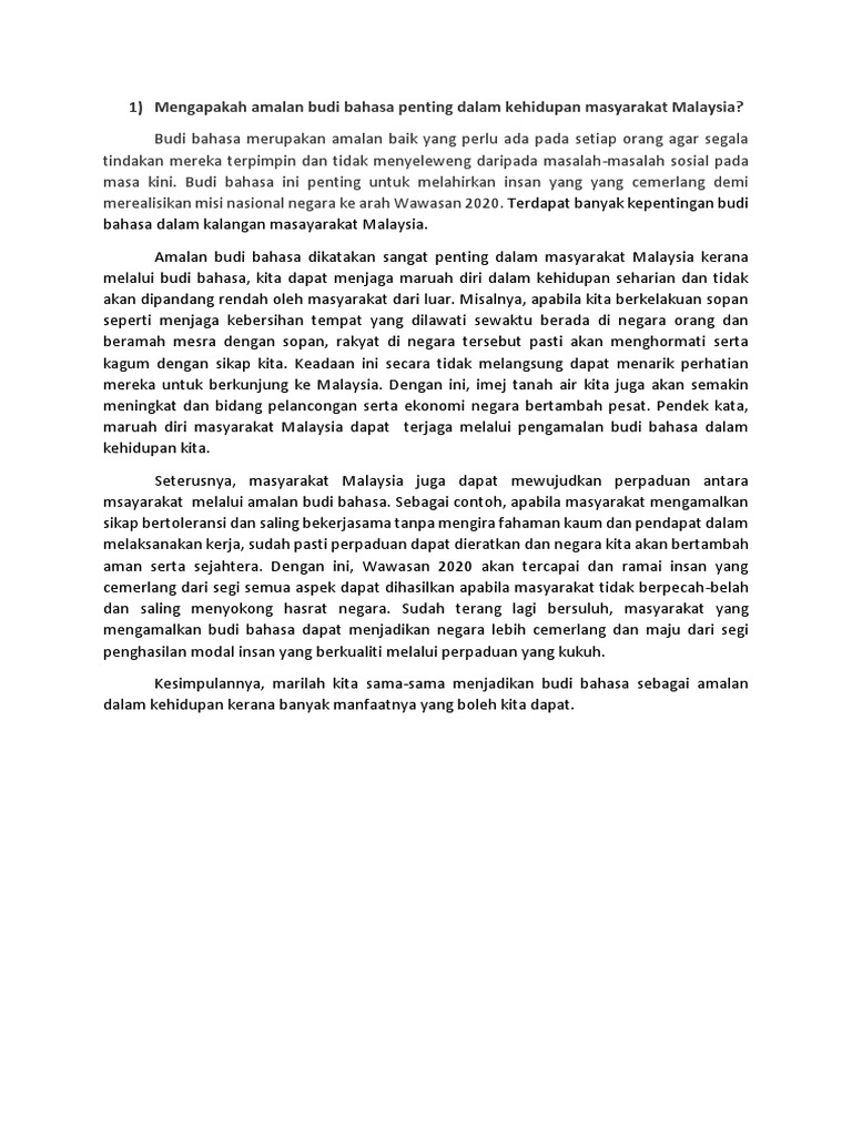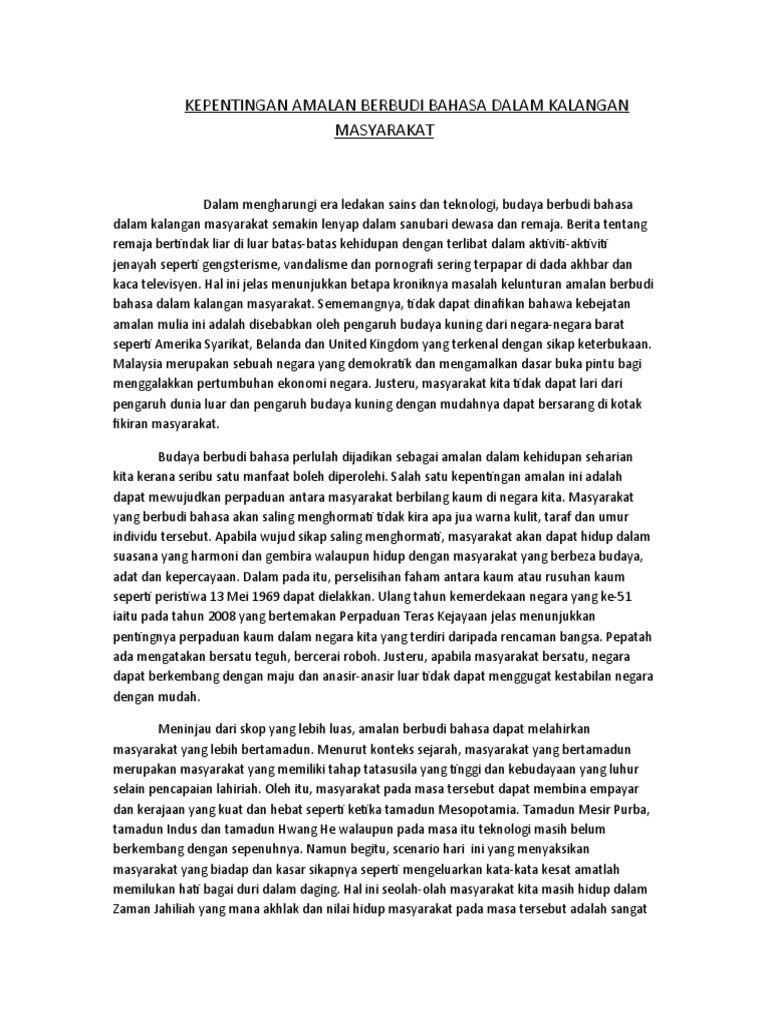 Kepentingan berbudi bahasa dalam masyarakat malaysia. Kepentingan berbudi bahasa dalam masyarakat malaysia terdapat banyak kepentingan berbudi bahasa dalam masyarakat iaitu dapat mewujudkan perpaduan antara masyarakat berbilang kaum di negara kita. Masyarakat malaysia yang berbudi bahasa akan saling menghormati dan membantu tanpa mengira bangsa kepercayaan budaya serta agama. Bincangkan kepentingan amalan berbudi bahasa dalam masyarakat. Tambahkan maklumat berkaitan dengan konsep budi bahasa dalam masyarakat malaysia dalam blog anda daripada sumber lain yang anda cari mengikut kamus dewan edisi keempat budi ditakrifkan sebagai kebajikan bahasasebagai sistem lambang yang dipakai sebagai alat perhubungan dalam lingkungan satukelompok manusia.