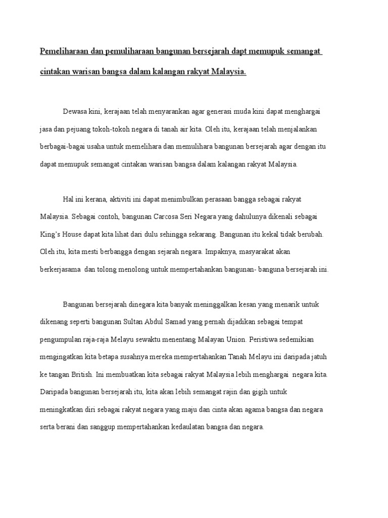 Bangunan bersejarah merupakan sebuah bangunan yang dibina pada zaman dahulu yang menceritakan evolusi manusia dan memberi nilai sejarah yang berlaku di tanah air kita. Oleh itu bangunan bersejarah di negara kita sememangnya tidak perlu diruntuhkan kerana yang baik dijadikan teladan yang buruk. Tidak kenal maka tidak cinta begitulah peribahasa yang dapat menggambarkan perasaan kita terhadap sesuatu sumber sejarah. Huraikan pendapat anda tenta.