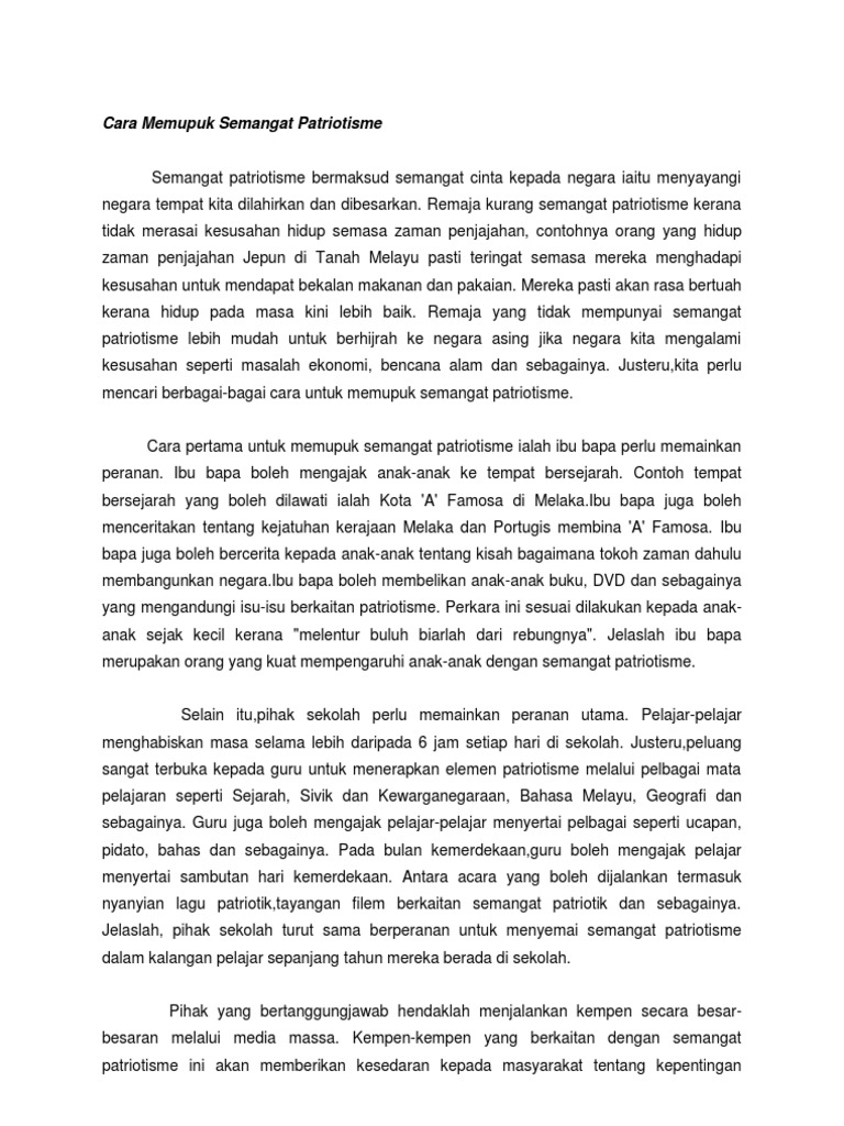 Maka berikut dikongsikan contoh karangan langkah memupuk semangat patriotik dalam kalangan masyarakat untuk panduan semua. Dengan wujudnya semangat cinta akan negara di kalangan rakyat pasti negara akan terus aman dan damai. Sama ada kita sedar atau tidak isu isu yang berkaitan dengan semangat patriotisme kerap menjadi bahan perbincangan yang hangat di media massa setiap kali menjelangnya hari kemerdekaan negara. Kesimpulannya cara untuk memupuk semangat patriotisme perlulah dijalankan sepanjang masa tanpa henti.