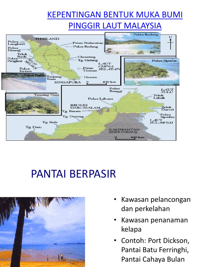 Malaysia dikelilingi oleh laut china selatan selat melaka laut sulawesi dan laut sulu yang terletak kerana terletak di pentas sunda. Pinggir laut bentuk muka bumi pinggir laut. A pantai berpasir kawasan pelancongan dan perkelahan kawasan penanaman kelapa contoh. Portdickson pantaibatu ferringhi pantai cahayabulan.