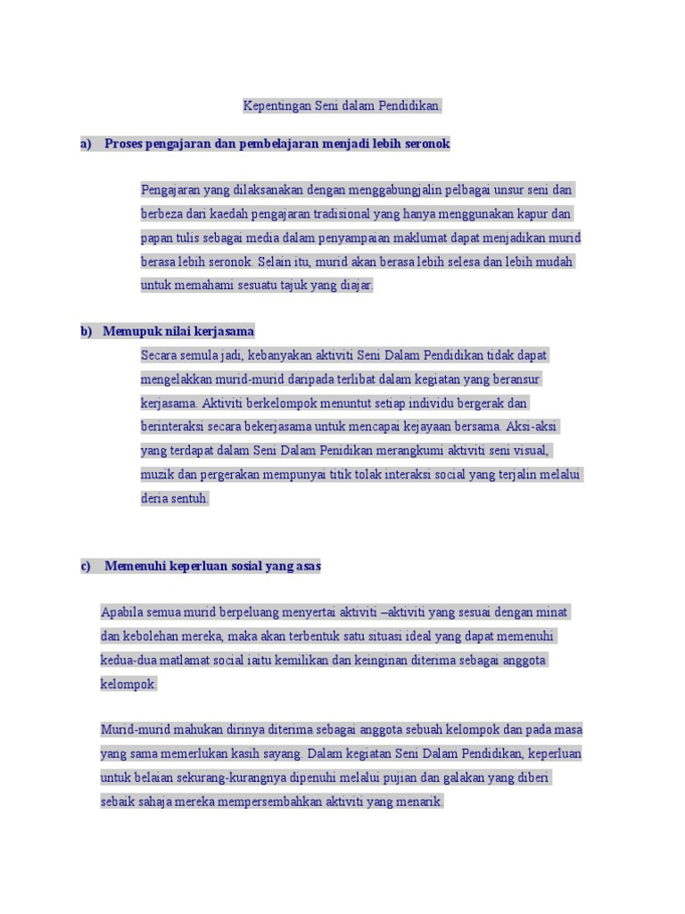 Kepentingan seni dalam pendidikan. Di dalam pendidikan seni visual mengutamakan proses berbanding dengan hasilan akhir. Seni tari di indonesia juga bisa masuk kedalam beberapa golongan dalam katagori sejarah seni tari indonesia dapat dibagi ke dalam tiga era. E aspek sosial dan emosi. Tajuk ini juga meliputi maklumat dan latihan berkaitan pandangan dan sumbangan tokoh tokoh seni dan pendidik seni visual.