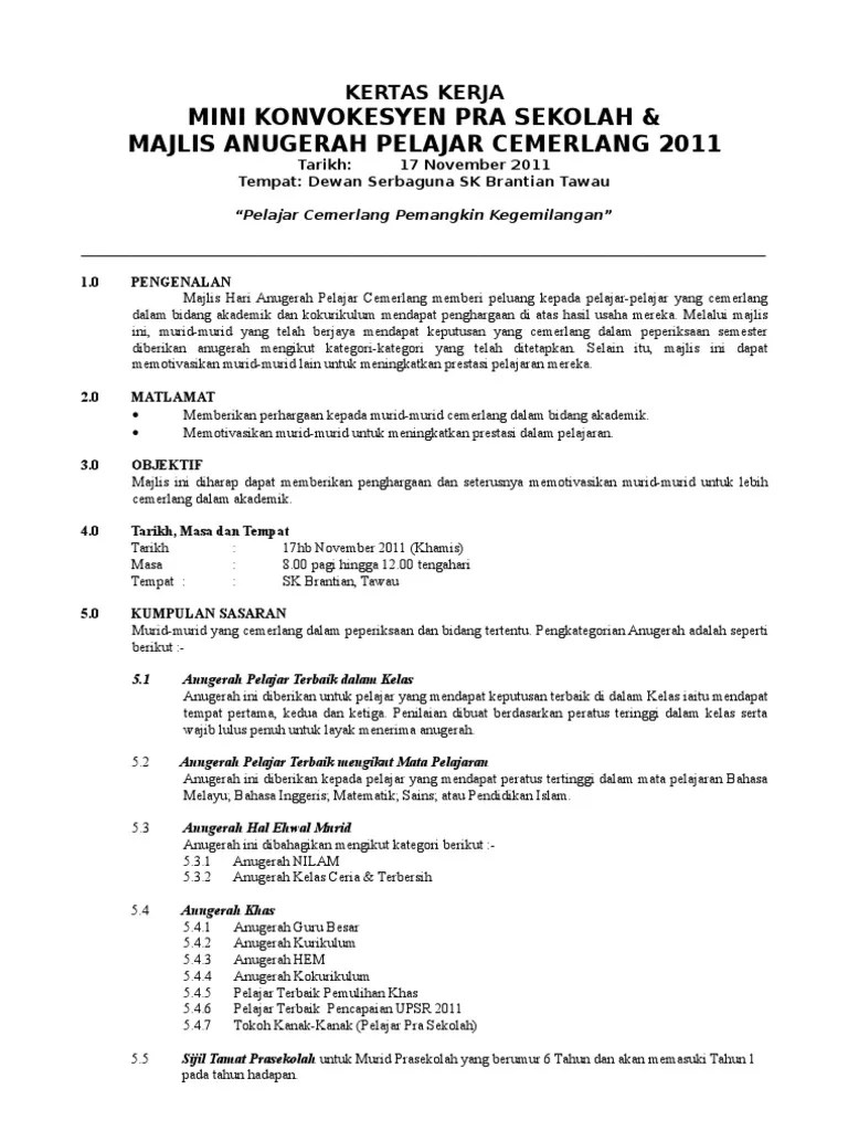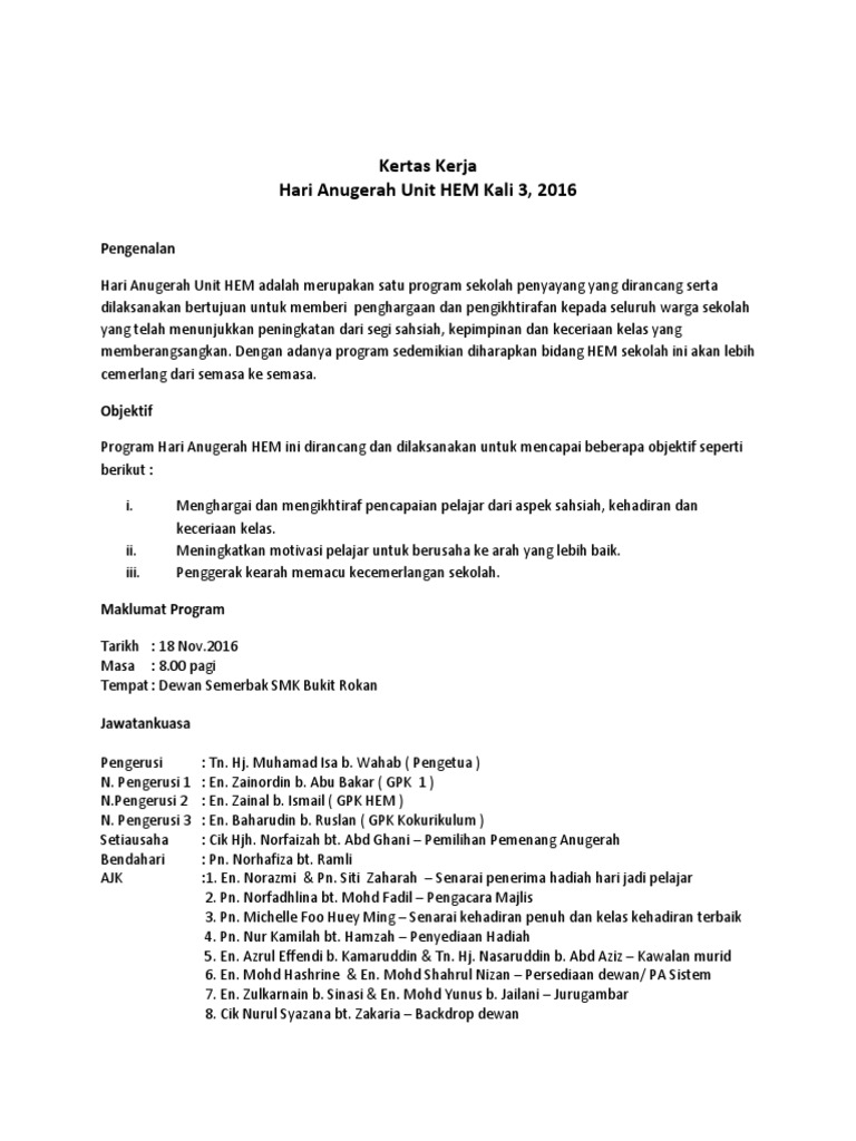 Hari ini dialog prestasi mengenai mesyuarat anugerah hem sukan dan kokurikulum 2015 program pengantarabangsaan jepun dan majlis graduasi sekolah. Menaikkan dan menyemarakkan semangat guru guru. Contoh sedikit berkenaan dengan kertas kerja. Contoh kertas kerja hari anugerah tajuk kertas cadangan majlis anugerah cemerlang pendahuluan majlis anugerah cemerlang merupakan program yang mengiktiraf kejayaan.