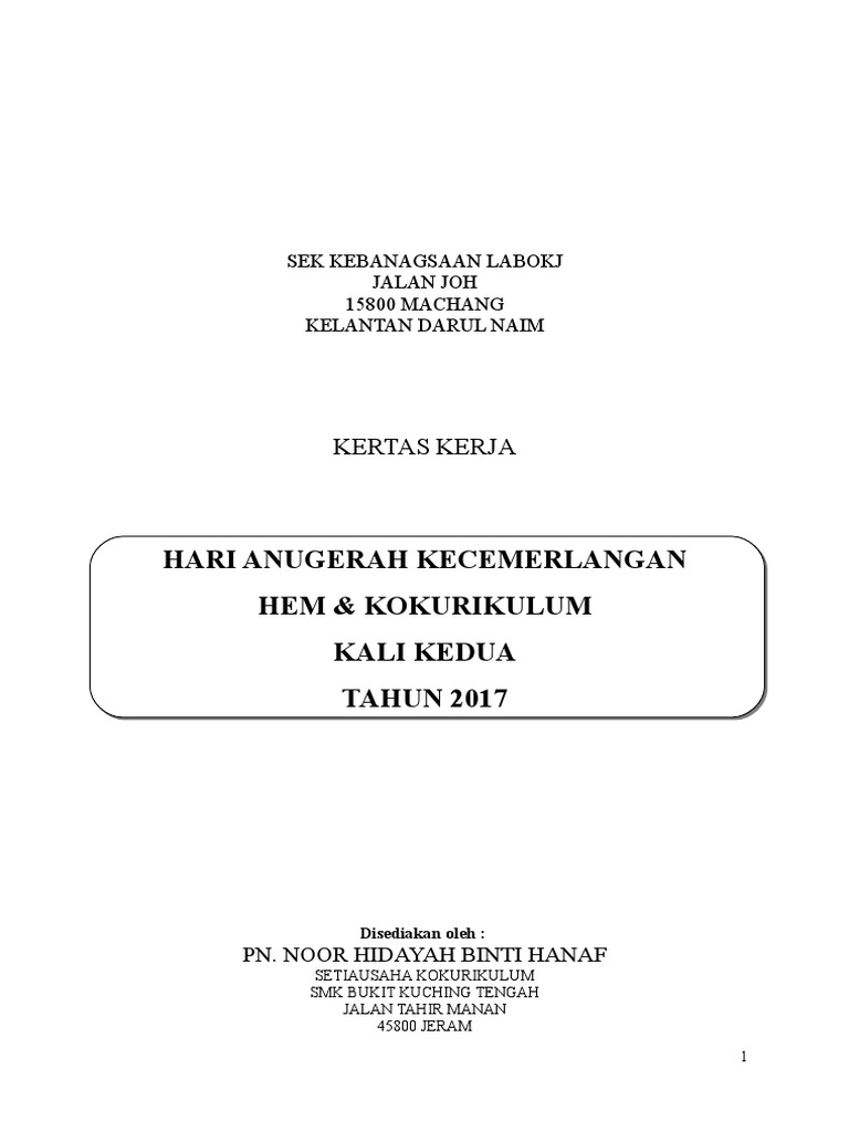 Kertas kerja hari anugerah hem. Hadirin sekalian tirai majlis kita pada hari ini akan dimulakan dengan ucapa alu aluan untuk itu majlis dengan hormat dan bangganya menjemput yang berusaha tuan haji mohammed nashan b singgan pengetua smk kampong jawa merangkap pengerusi majlis anugerah kecemerlangan hem dan kokurikulum smk kampong jawa tahun 2016 untuk menyampaikan ucapan alu aluan. Nama program majlis graduasi dan anugerah hal ehwal murid 2011. Pendahuluan sekolah berkesan ialah sekolah yang memperlihatkan pencapaian pelajar yang cemerlang baik daripada segi akademik mahupun daripada aspek pembentukan sahsiah dan kokurikulum. Anugerah pasangan kembar murid 3 x rm20.
