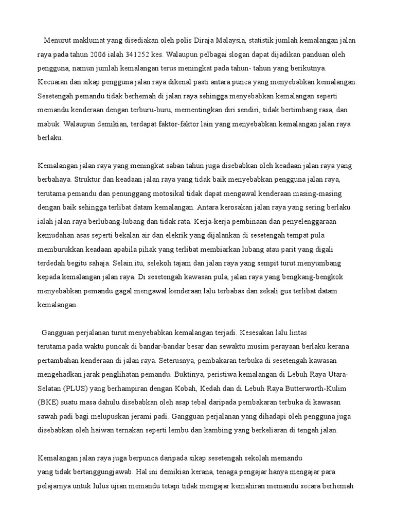Tulis satu karangan tentang usaha usaha yang perlu diambil untuk menangani masalah ini. Sesetengahnya pula menjadikan jalan raya sebagai litar perlumbaan. Pemandu yang melanggar peraturan jalan raya hendaklah disaman dan didakwa di mahkamah untuk dijadikan pengajaran kepada orang lain. Selain itu kemalangan juga disebabkan oleh keadaan jalan raya yang tidak baik.