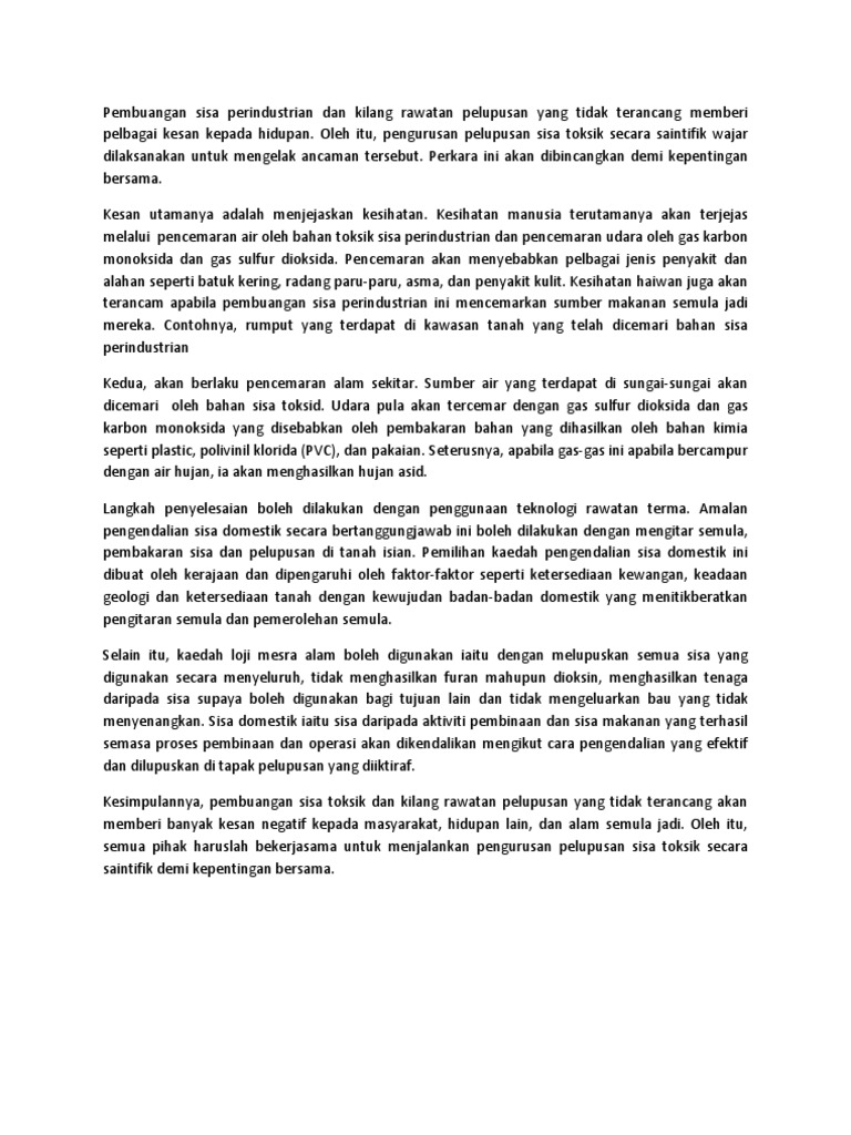 Kesan pembuangan sisa toksik dari kilang. Misalnya dengan wujudnya kilang kilang maka didapati pencemaran alam sekitar tidak dapat dielakkan. Mereka masih meneruskan pembuangan bahan kimia tersebut ke dalam teluk minamata. Memang di samping kesan positif terdapat juga kesan yang negatif seperti pencemaran alam sekitar. Ad 1 kuala lumpur 14 mac bernama pengusaha kilang di sekitar pasir gudang yang mempunyai sisa toksik berbahaya dalam simpanan mereka diminta supaya tidak melakukan pembuangan panik susulan pemeriksaan besar besaran pihak berkuasa.