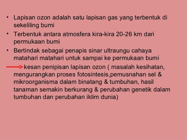 Kesan penipisan lapisan ozon terhadap alam sekitar manusia. Lapisan ozon adalah satu lapisan gas yang terbentuk di sekeliling bumi terbentuk antara atmosfera kira kira 20 26 km dari permukaan bumi bertindak sebagai penapis sinar ultraungu cahaya matahari matahari untuk sampai ke permukaan bumi kesan penipisan lapisan ozon masalah kesihatan mengurangkan proses fotosintesis pemusnahan sel mikroorganisma dalam binatang tumbuhan hasil. Pendidikan alam sekitar 2 pendidikan jasmani dan kesihatan 24 pendidikan sivik 5 pengajian sosial 25. Faktor atau punca punca pencemaran udara. Semakin banyak ozon dalam udara semakin tinggi haba disimpan.