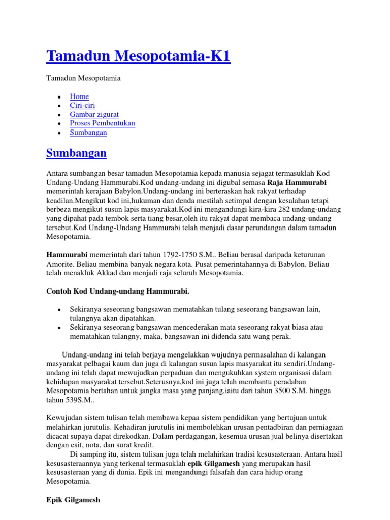 Kod undang undang hammurabi tamadun mesopotamia. Ia digubal oleh raja hammurabi pemerintah babylon. Ia mengandungi 282 undang undang dan dipahat pada tembok tiang besar untuk kesenangan dibaca rakyat. Sumbangan tamadun mesopotamia 1 suruhanjaya reid 3 tamadun awal ciri 1 tamadun china 1 tamadun hwang ho 5 tamadun india 3 tamadun indus 5. Tamadun mesopotamia merupakan tamadun terawal didunia.
