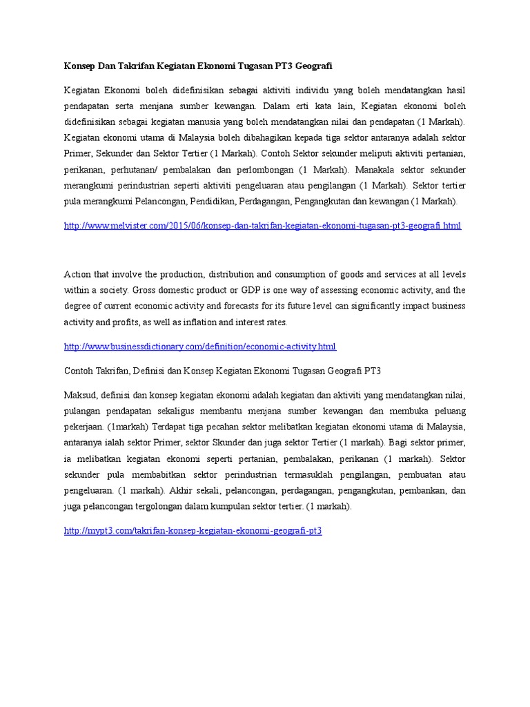 Konsep dan takrifan kegiatan ekonomi tugasan pt3 geografi. Ekonomi adalah ilmu yang mengkaji bagaimana manusia mengagihkan sumber sumber ekonomi yang terhad bagi memenuhi keperluan dan kehendak manusia yang tidak terhad. Konsep dan takrifan kegiatan ekonomi geografi pt3 2015 assalamualaikum objektif pertama kajian dalam membuat tugasan geografi pt3 tahun 2015 adalah mentakrifkan kegiatan ekonomi. Contoh konsep menurut buku teks geografi tingkatan 3 halaman 114 kegiatan ekonomi bermaksud sebarang kegiatan manusia yang mendatangkan nilai dan pendapatan.