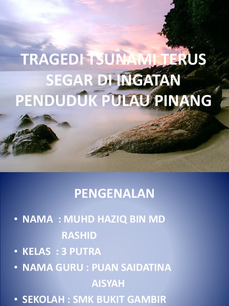 Walaupun telah 10 tahun berlalu bencana tsunami yang melanda rantau ini pada 2004 masih segar dalam ingatan penduduk kampung di sini malah kenangan pahit itu turut dikenang oleh 52 anggota keluarga mangsa yang terkorban dalam kejadian tsunami di beberapa pantai di pulau pinang pada 26 dis 2004. Walaupun kehilangan taraf pelabuhan bebas zon perdagangan bebasnya yang terletak berdekatan dengan lapangan terbang antarabangsa pulau pinang di selatan pulau menjadi salah satu daripada pusat pusat perkilangan elektronik yang terbesar di wilayah asia dari 1970 an sehingga akhir 1990 an. Tepat di serambi mekkah yaitu aceh tsunami menimbulkan lembaran duka dalam sejarah indonesia. Gempa bumi bawah laut.
