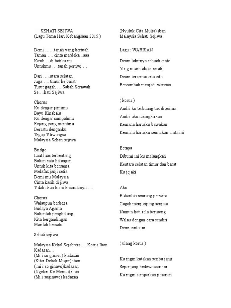 Lagu lagu patriotik semperna bulan kemerdekaan. Lirik lagu sehati sejiwa lagu tema hari kemerdekaan 2015 alif satar gemersik chorus. Sehati sejiwa salam kemerdekaan ke 59. Lagu merdeka 58 sehati sejiwa mp3 download.