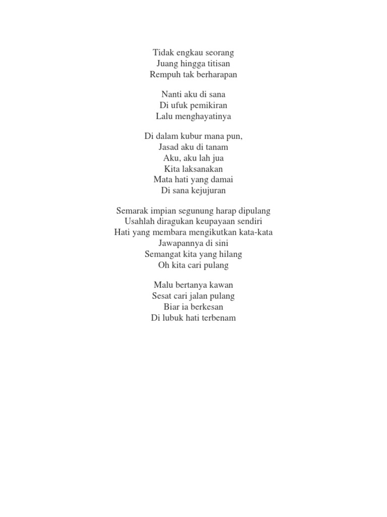 Lagu semangat yang hilang. Selain menenangkan diri secara solo anda juga boleh mengembalikan semangat anda dengan mendengar beberapa lagu rancak dan juga berbentuk motivasi. Untuk pembelian lagu sila beli melalui laman media streaming yang sah atau pun apa apa saluran lain yang dibenarkan oleh undang. Malu bertanya kawan sesat cari jalan pulang biar ia berkesan di lubuk hati terpendam. Semangat yang hilang oh.