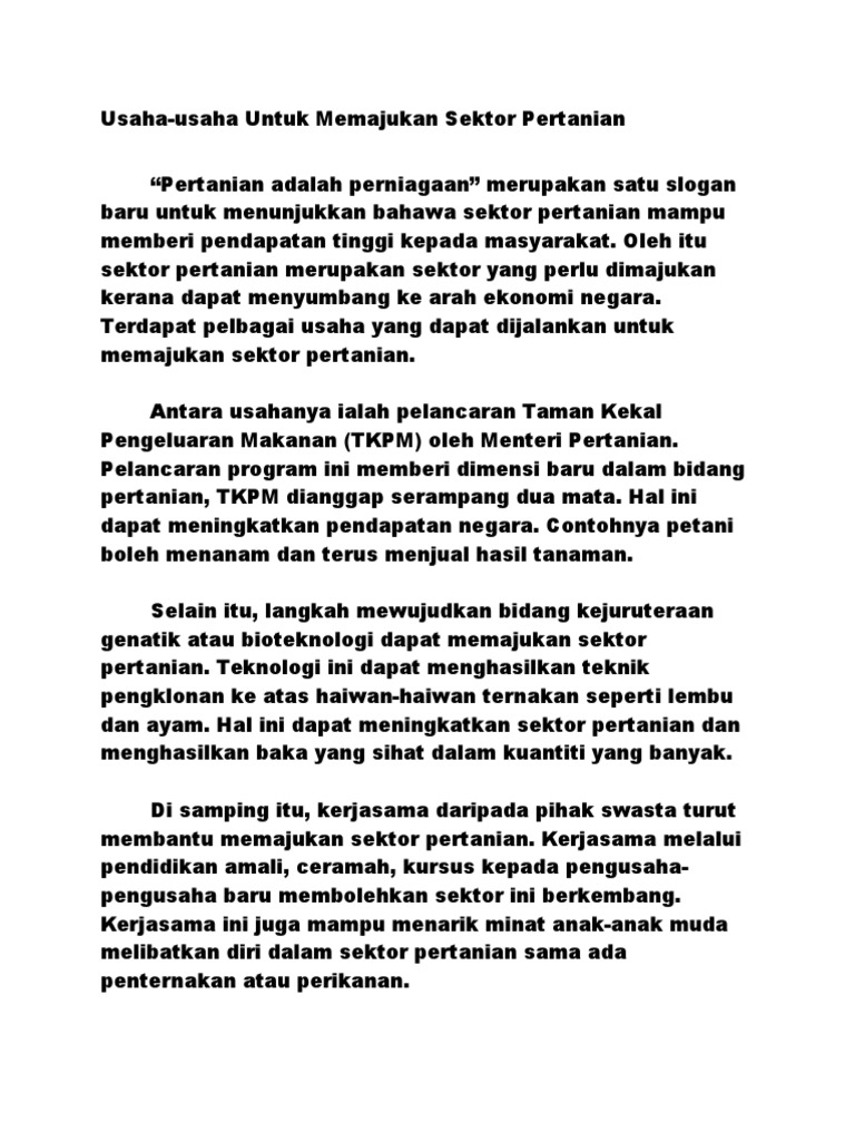 Langkah memajukan sektor pertanian karangan. Masalah sektor ini belum dapat dimajukan ialah negara kita kekurangan tenaga kerja mahir dan separa mahir. Rentetan daripada itu sektor pertanian telah dikesisikan dalam arus pembangunan sejak 1980 an. Ipendidikan karangan langkah langkah memajukan sektor pertanian di malaysia disemak dan dikemaskini pada pukul 9 07 pm 9 ogos 2020 perhatian kepada pelajar yang akan mengambil kertas peperiksaan mata pelajaran bahasa melayu. Cara untuk memajukan sektor pertanian sektor pertanian merupakan salah satu sektor yang penting ynag mendapat tumpuan dalam perdagangan dunia kerana sektor ini merupakan pembekal makanan dan sumber bahan mentah kepada penduduk di dunia.