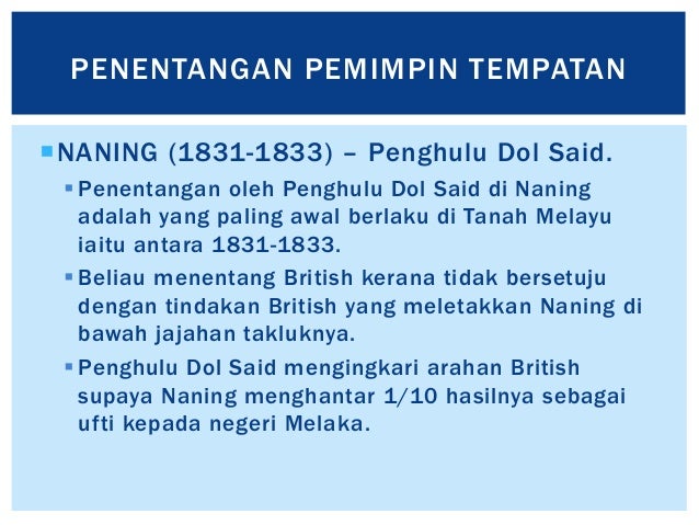 Dol said diberi pencen dan rumah di melaka. 2 bab pertama pendahuluan 1. Dol said secara keras membantah kemasukan tentera british di naning dengan menunjukkan kebijaksanaannya di dalam perang. 2 sebab sebab penentangan di naning terhadap british.