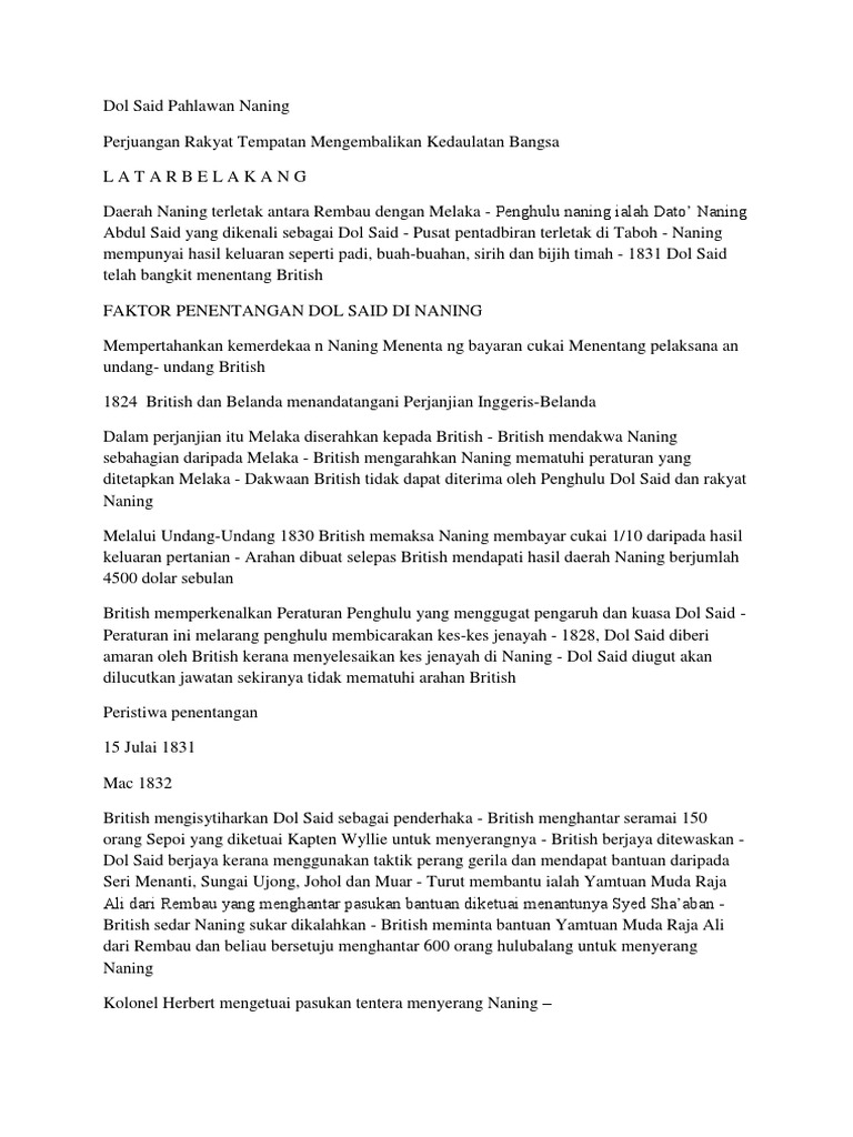 Latar belakang dol said pdf. عبد السيد بن عمر atau dol said 1773 ogos 1849 ialah penghulu naning yang kesembilan mohd shah bin mohd said al haj tambo alam naning dbp 2000 ms 184 perang naning yang berlaku pada tahun 1831 menjadikan beliau seorang pahlawan yang telah mengukir tempat di sejarah melaka daripada suku semelenggang dol said mewarisi penghulu. Dol said atau nama sebenar beliau abdul said lahir dalam tahun 1773 di naning alor gajah melaka dan berasal dari suku semelenggang merupakan seorang pahlawan melayu yang kental. Ini kerana dol said memiliki sifat berpantang mati sebelum ajal. Dol said terpaksa berundur ke seri menanti dan akhirnya menyerah diri kepada pihak british.