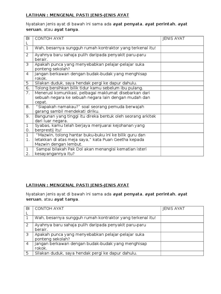 120 soalan latihan pola ayat ujana sintaksis 1. Ayat ayat dalam bahasa melayu boleh dibahagikan kepada empat jenis iaitu ayat penyata ayat tanya ayat perintah dan ayat seruan. Pemuda itu membawa ibunya ke klinik. Latihan kendiri tatabahasa jenis jenis ayat 1 ayat penyata 2 ayat seruan 3.