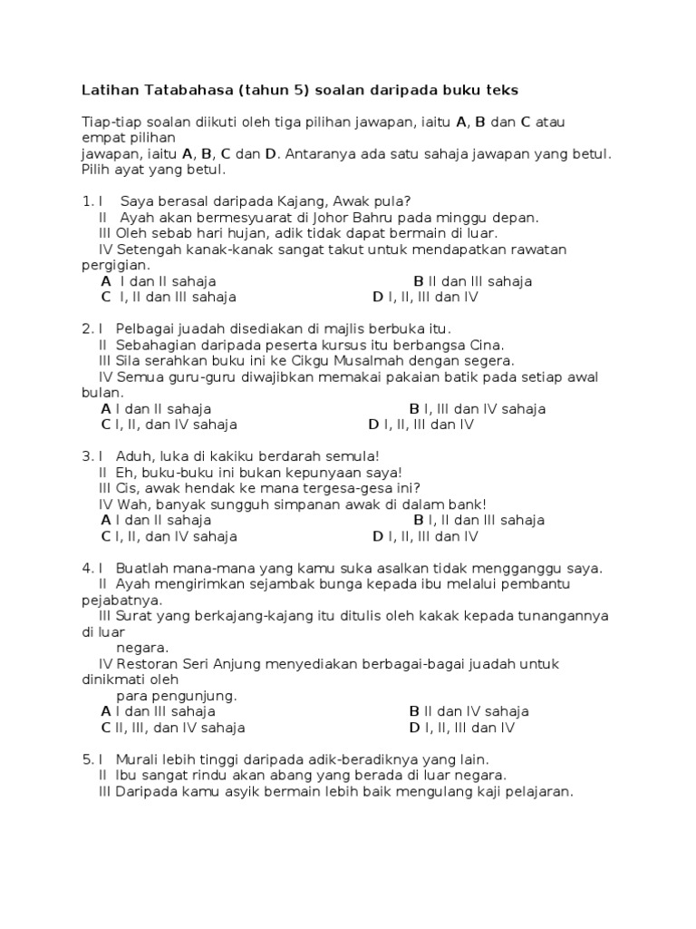 Latihan bahasa melayu tahun 5 tatabahasa. Tiap tiap soalan diikuti oleh tiga pilihan jawapan. Antaranya ada satu sahaja jawapan yang betul. Melalui penggunaan ict para guru boleh memaksimumkan penambahan perkongsian pembelajaran secara online sama ada pembelajaran secara jarak jauh atau pembelajaran kendiri tanpa mengambil kira lokasi dan tahap. Kertas 2 bahagian a kertas 2 bahagian b kertas 2 bahagian c latihan tatabahasa.