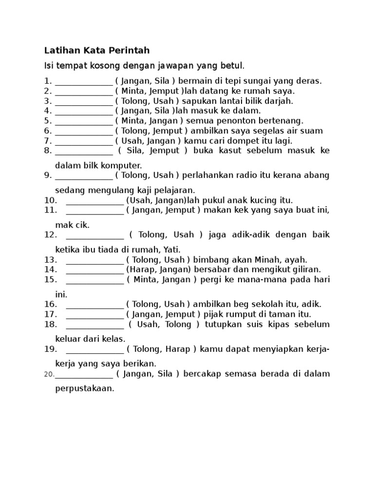 Latihan isi tempat kosong dalam ayat ayat di bawah dengan jawapan yang paling sesuai. Berikut merupakan latihan pengukuhan tatabahasa bm yang sesuai untuk murid tahap 2 tahun 4 5 6. Tolong usah jaga adik adik dengan baik ketika ibu tiada di rumah yati. Kata perintah tahun 4 draft.