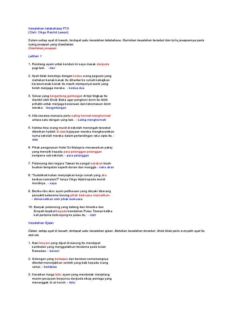 Cikgu rashid lewan dalam setiap ayat di bawah terdapat satu kesalahan tatabahasa gariskan kesalahan tersebut dan tulis jawapannya pada ruang jawapan yang disediakan. Disertakan jawapan latihan 1 1. Garis kesalahan bahasa tersebut dan tulis jawapan yang betul pada ruang jawapan yang disediakan. Pada entri ini kami di mypt3 akan berkongsi dengan anda semua berkenaan kesalahan yang sering pelajar lakukan.