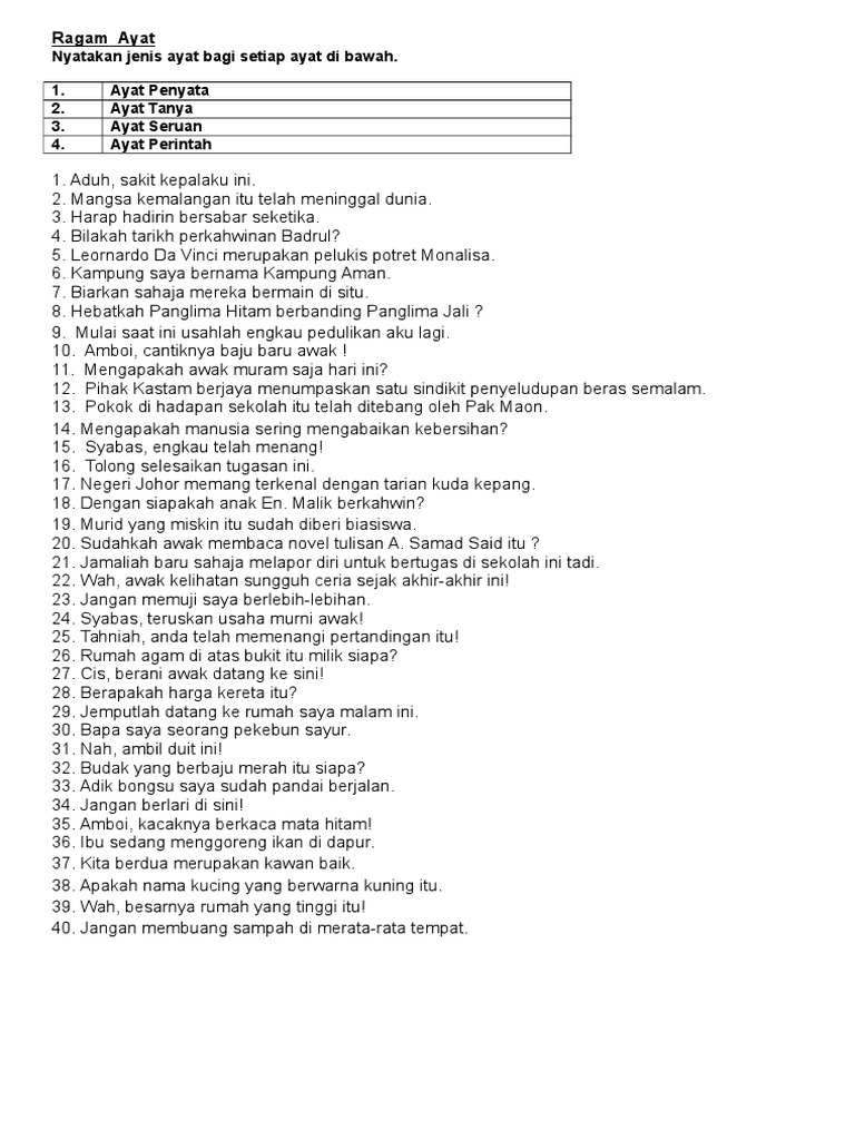 Latihan ragam ayat tahun 5. Tiap tiap soalan diikuti oleh tiga pilihan jawapan iaitu a b dan c atau empat pilihan jawapan iaitu a b c dan d. A menenun c memilin. Keterangan dan contoh ayatayat tersebut adalah seperti berikut. Bunga kebangsaan pada 30 september 2010.