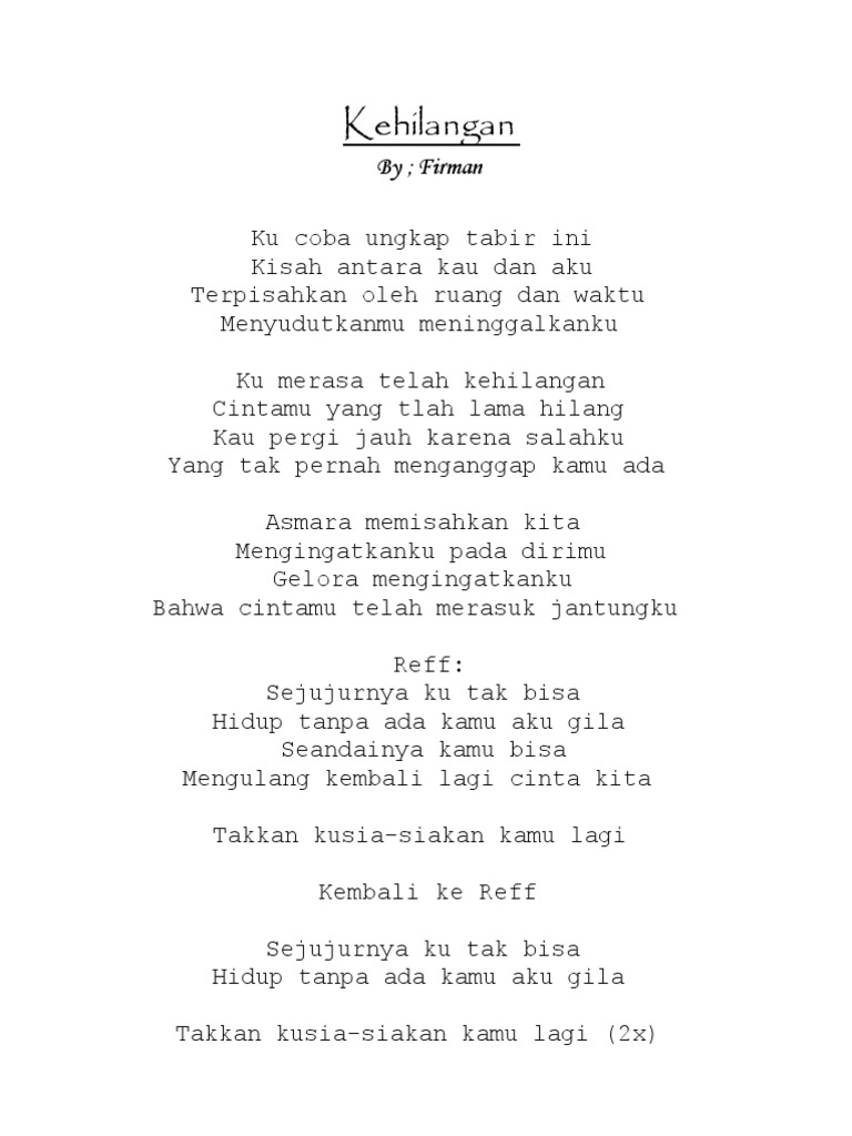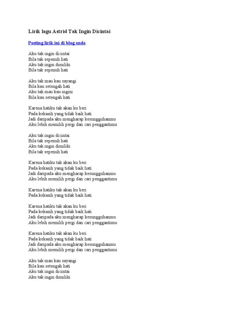 Lirik lagu aku tak ingin engkau pergi aku tak ingin engkau jauh. Maaf ku tak sadari c m hingga membuat kau ingin pergi int a c m a saat ku tak bicara c m berjuta kata yang ku ungkapkan a walau kau tak merasa c m cinta yang ada begitu nyata f m e ku ingin engkau tahu berartinya dirimu f m e ku tak inginkan kau ragu aku kan bertahan dalam hidupmu chorus a. Engkaukah aku tak ingin menjemputmu biarlah kau hanya berdiri di depan pintu kau hancurkan hatiku kau musnahkan harapanku pulanglah ke tempat asalmu tempat asalmu oh. Engkau jauh di mata. Berikut cuplikan syair nyanyian teks lagunya aku tak ingin engkau ada di samping yang lain bila waktu izinkanku dekap bayangku bersamamu bila kau dekat peluk tubuhku janjilah padaku tetap setia aku tak.