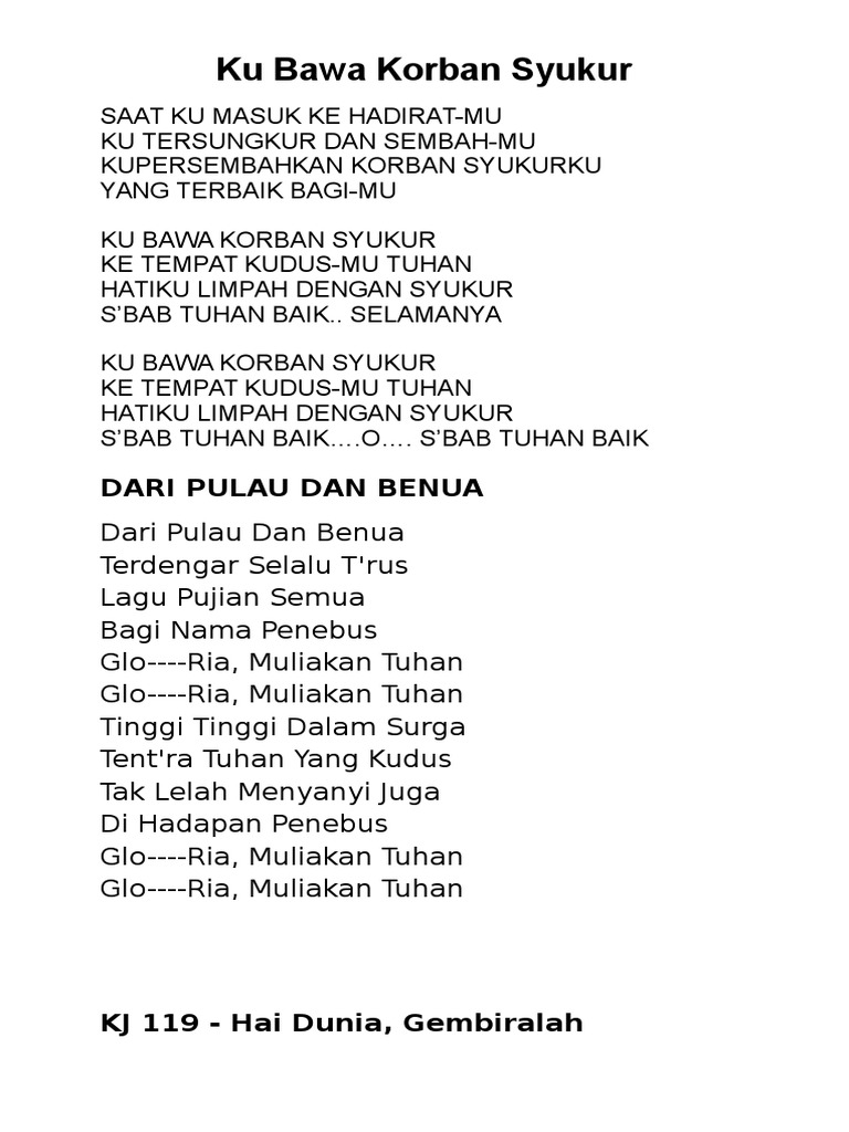 Lirik lagu dari pulau dan benua. Sumber terlengkap lirik lagu rohani kristen lirik lagu rohani lirik lagu kristen kidung pujian himne nyanyian praise and worship. Dari pulau dan benua terdengar selalu trus lagu pujian semua bagi nama penebus glo ria in excelsis deo glo ria in excelsis deo tinggi tinggi dalam surga tentra tuhan yang kudus tak lelah menyanyi juga di hadapan penebus glo ria in excelsis deo glo ria in excelsis deo. Lirik dari pulau dan benua oleh glenn fredly. Lirik lagu rohani wednesday 24 december 2014.