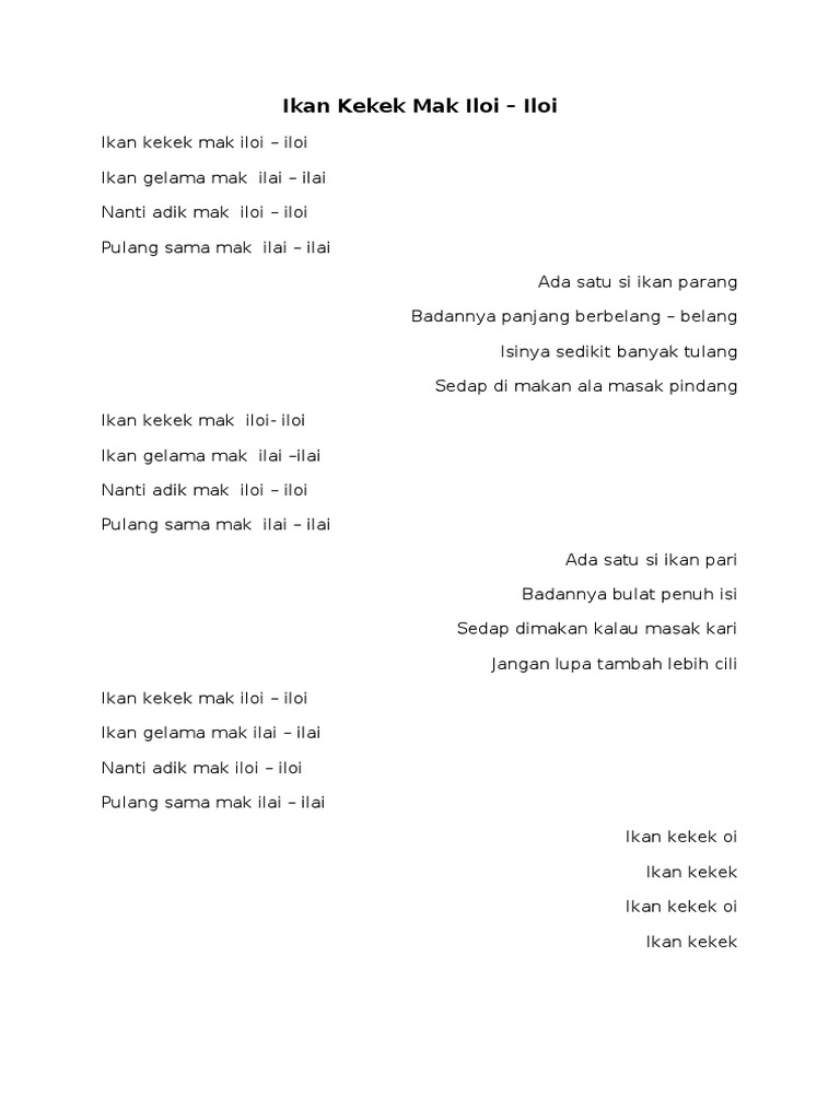 Lirik lagu kanak kanak lagu kanak kanak lagu 1 bangun pagi bangun pagi gosok gigi cuci muka terus mandi pakai baju minum susu salam ayah dan ibu. Lirik lagu ikan kekek dodoi si manja ikan kekek mak ilui ilui ikan gelama mak ilai ilai nanti adik mak ilui ilui pulang sama mak ilai ilai tenang tenang air di laut sampan golek mudik ke tanjung hati terkenang mulut tersebut budi yang baik rasa dijunjung. Kenek keneklah udang lembu patah tanduk cik mek kenalah godam cik awang kena tumbuk oa oa oa oa. Di blog ini kami hanya memaparkan lirik lagu.