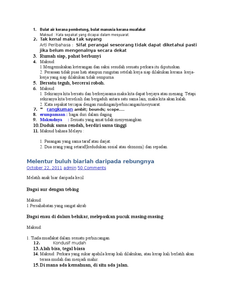 Mementingkan diri sendiri tidak bersepakat. Sikap mementingkan diri sendiri yang digambarkan melalui maksud peribahasa ini merupakan satu sifat yang buruk dan wajar dihindari. Peribahasa bagai enau di dalam belukar melepaskan pucuk masing masing dapat anda gunakan dalam kehidupan sehari hari baik dalam bentuk lisan maupun tulisan sebagai suatu perumpamaan yang mempunyai arti tidak ada kata mufakat pada suatu perbincangan. Peribahasa bagai enau di dalam belukar melepaskan pucuk masing masing merupakan peribahasa berbahasa indonesia yang dimulai dengan huruf b.