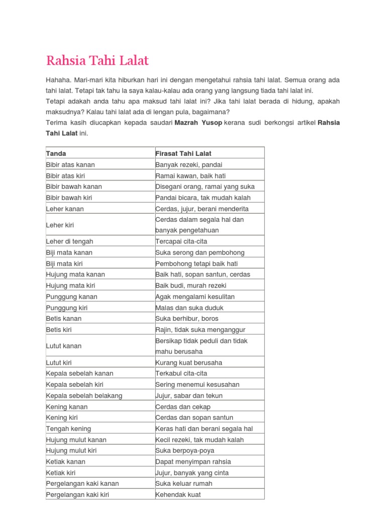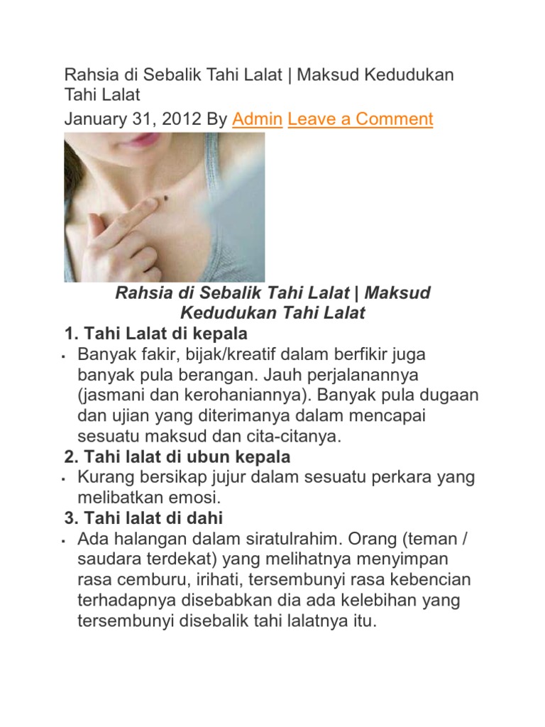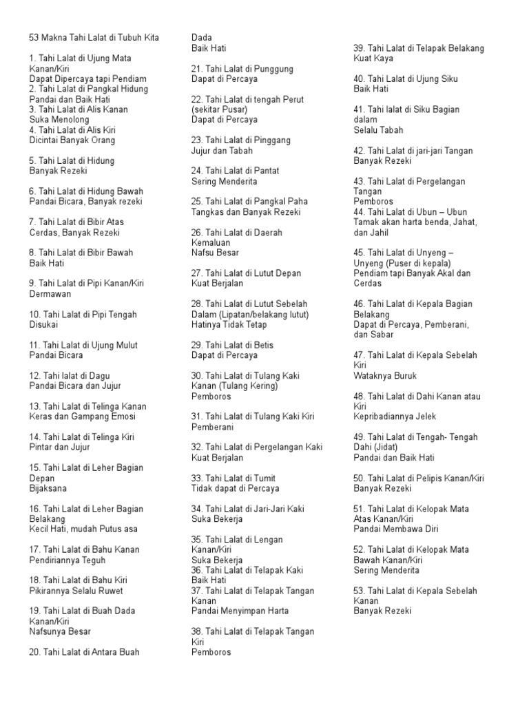 Arti letak tahi lalat di tubuh kali ini akan membahas tentang makna tahi lalat jika anda memiliki tahi lalat di bagian tubuh anda jangan mempunyai keinginan untuk menghilangkannya sebelum tahu 50 mitos arti tahi lalat di tubuh siapa tahu arti tahi lalat yang anda punya merupakan salah satu tahi lalat yang ada pada 50 mitos arti tahi lalat di tubuh. Arti tahi lalat di wajah manusia umumnya tahi lalat yang membawa keberuntungan adalah yang warnanya merah tua atau hitam pekat teksturnya lembut dan bersinar. Orang zaman dahulu pernah mengatakan bahawa rahsia tahi lalat di badan kita boleh diketahui berdasarkan tempat atau kedudukan tahi lalat tersebut. Di bahagian belakang badan pula sebaliknya.
