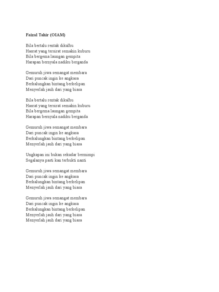 Am g f b e amku menyaksikan degdaun kekeringan dmgugur ke bumi gersang tiada ampenghuni emtiada mentari awandm kesuraman bagaifkan wakbtu yang terheneti amku menyaksikan sergaut wajah cinta dmyang kehampaan tiada lagami bermaya emkini kehilangan sebuahdm harapan bagaifkan cinta gyang terkuburam emadakah mungkin. Membawa semangat jiwa merdeka semarak jaya kami warganya empat belas melintang jalurnya semua negeri dalam malaysia satu suara satu semangat itu sumpah warga berdaulat. Merahmu bara semangat waja putihmu bersih budi pekerti kuning berdaulat payung negara biru perpaduan kami semua. Hanya cinta yang bisa.
