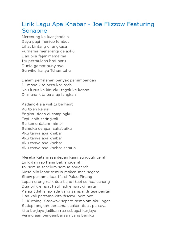 Lirik lagu jeo flizzow sonaone apa khabar merenung ke luar jendela bayu pagi meniup lembut lihat bintang di angkasa purnama menerangi gelapku dan bila fajar menjelma itu permulaan hari baru dunia gamat bunyinya sunyiku hanya tuhan tahu dalam perjalanan banyak persimpanga.