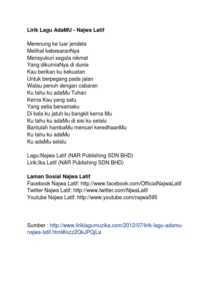 Dalam perjalanan banyak persimpangan di mana kita bertukar arah kau lurus ke kiri aku tegak ke kanan. Lirik lagu adamu najwa latif merenung ke luar jendela melihat kebesarannya mensyukuri segala nikmat yang dikurniakan di dunia.