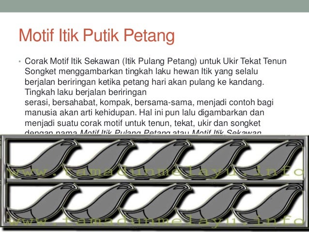 Hal ini pun lalu digambarkan dan menjadi suatu corak motif untuk tenun tekat ukir dan songket dengan nama motif itik pulang petang atau motif itik sekawan. Tingkah laku berjalan beriringan serasi bersahabat kompak bersama sama menjadi contoh bagi manusia akan arti kehidupan. Tingkah laku berjalan beriringan serasi bersahabat kompak bersama sama menjadi contoh bagi manusia akan arti kehidupan. Batik melayu motif itik pulang petang sebagai masyarakat riau seharusnya kita mengetahui kebudayaan riau.