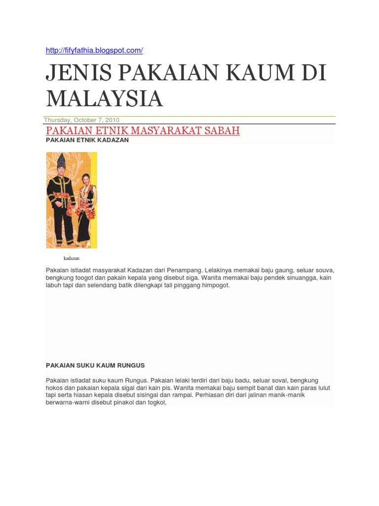 Satu daripadanya ialah blaus lengan pendek yang dipakai oleh wanita muda. Pakaian kaum lelaki seperti gaung baju lengan panjang souva seluar panjang hitam dengan ikat pinggang berwarna biru indigo kaking atau toogot bengkung pinggang hitam siga penutup kepala tupi sinikat topi bulat. Pakaian tradisional suku kaum kadazan sabah 1. Hidangan hidangan ini biasanya banyak disediakan di musim perayaan seperti pesta kaamatan yang dirayakan setiap tahun iaitu 30 dan 31 mei.